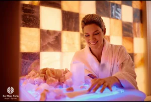 Không gian đá muối không ồn, không gắt. Hơi ấm dịu, ánh sáng trầm, khiến...