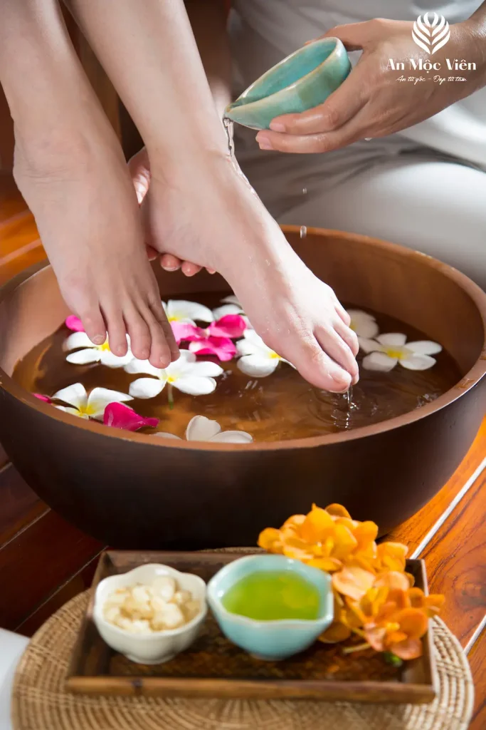 Trải nghiệm massage foot với nến thơm nóng, bấm huyệt bàn chân – trung tâm sinh lực thứ hai. Ngâm thảo dược miền đất võ thư giãn sâu, xua tan mệt mỏi, cải thiện tuần hoàn, mang lại cảm giác nhẹ nhàng, tinh thần thư thái, từng phút giây là khoảnh khắc chăm sóc toàn diện.